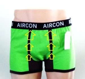 Get Aircon for your down under. Main parts of this Aircon underwear (boxer brief) are cotton rich (95% cotton), using mesh strips to improve ventilation. It’s specially patented designed for neither chafing nor overheating.As it’s cotton rich, sink it in cold water about 24 hours at first, then wash to stabilize the cotton fabric.